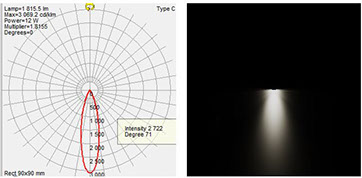The 'B' variant lens features a symmetrical round pattern dispersing light in a 25 degree cone. Used as a spotlight while horizontal or high bay light when vertical.